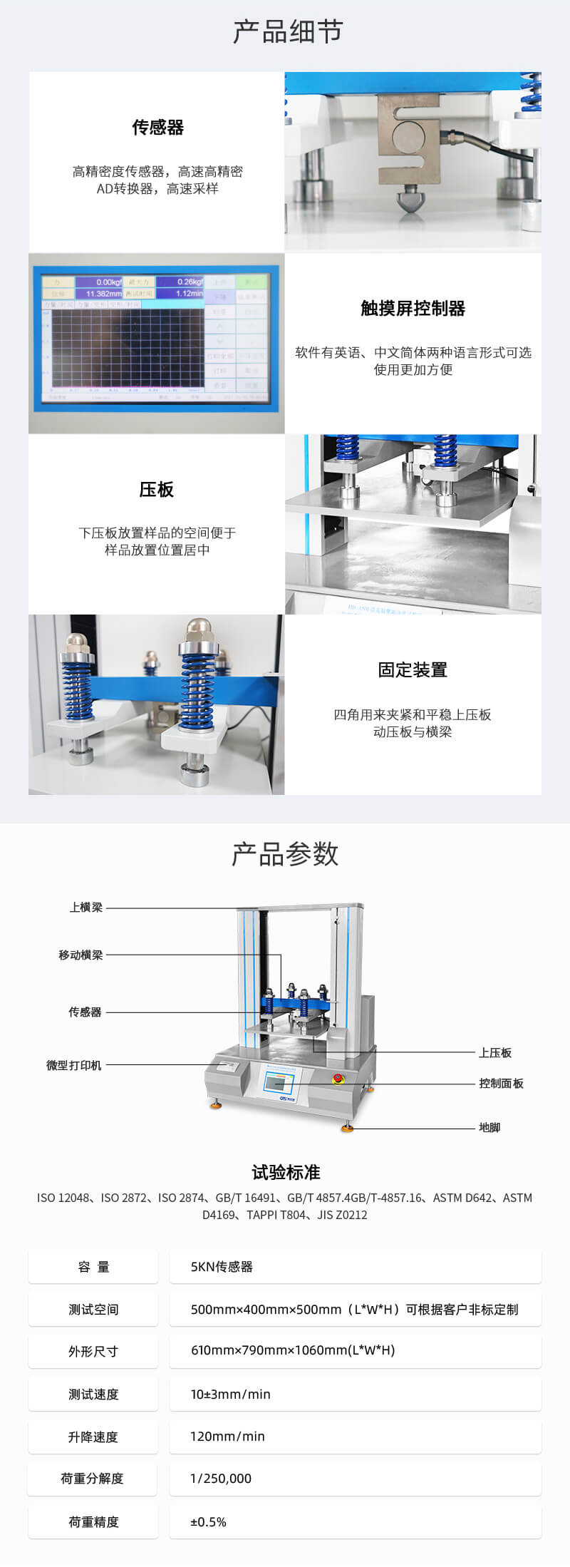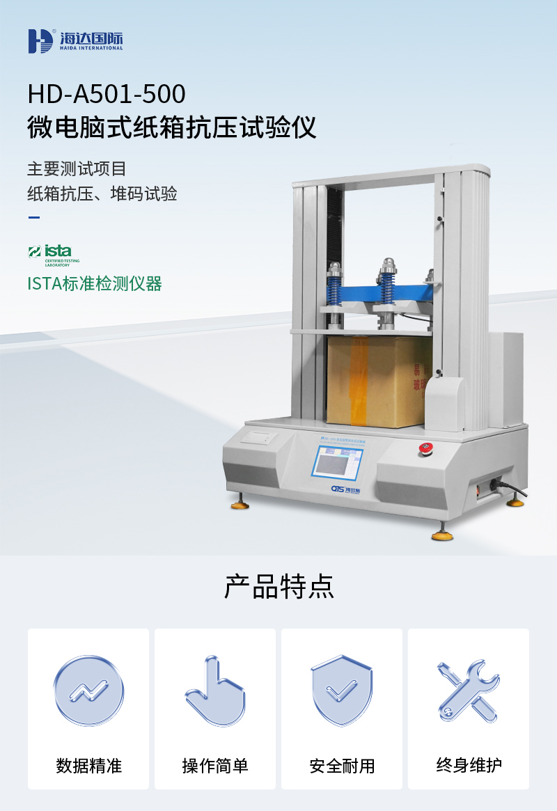ISO 12048-1994、ISO 2872-1985、GB/T 16491-2008、GB/T 4857.4-2008、ASTM D642-15、TAPPI T804?OM-2010、JIS Z0212-1998、ASTA 6(垂直壓力)等
