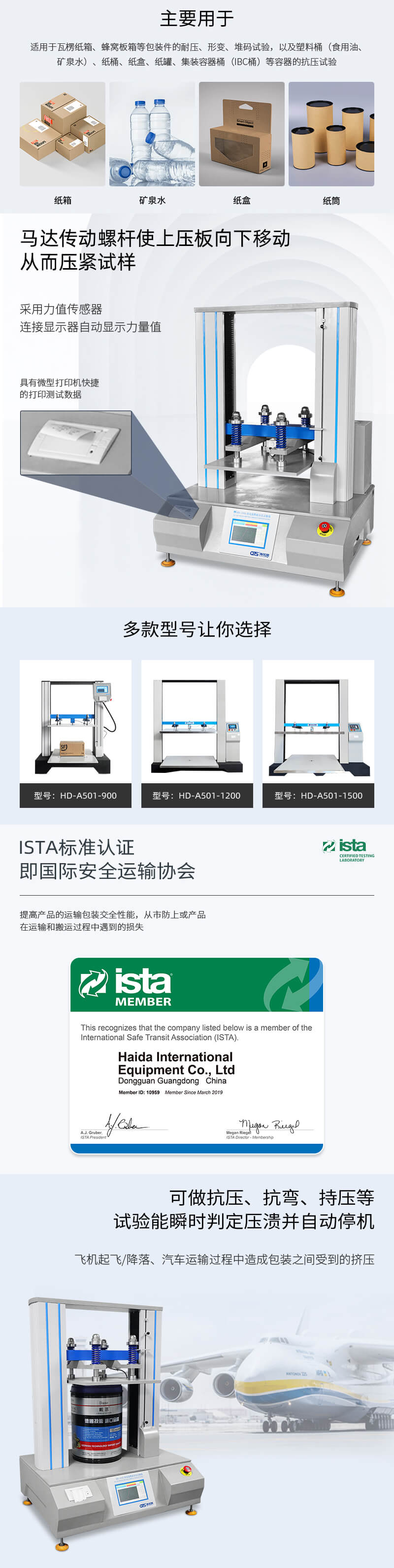 該產(chǎn)品適用于瓦楞紙箱、蜂窩板箱等包裝件的耐壓、堆碼試驗(yàn),以及塑料桶(食用油、礦泉水)、紙桶、紙盒、紙罐、集裝容器桶(IBC桶)等容器的抗壓試驗(yàn)(如果需要測(cè)定試驗(yàn)樣品在堆碼過(guò)程中受外界壓力載荷時(shí)的耐壓能力,建議使用此機(jī)臺(tái)進(jìn)行試驗(yàn))。