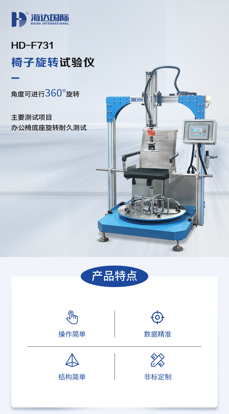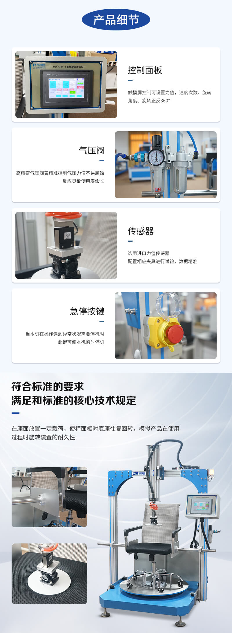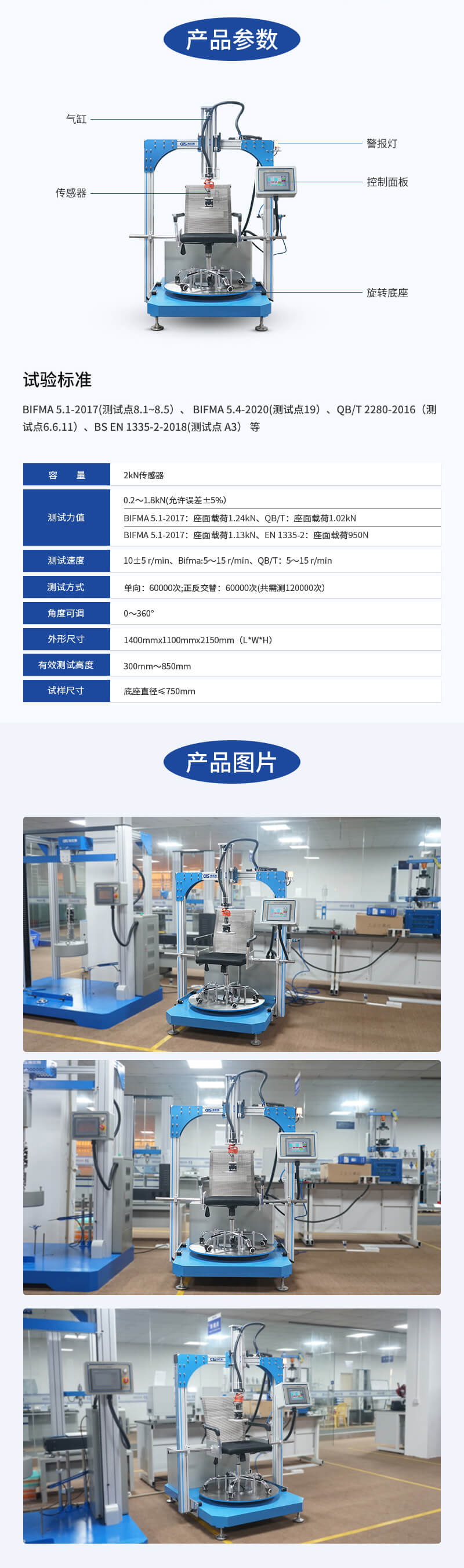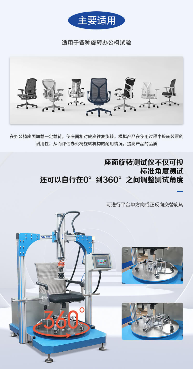 椅子旋轉(zhuǎn)試驗(yàn)機(jī)適用于辦公椅重復(fù)旋轉(zhuǎn)試驗(yàn),在辦公椅座面加載一定載荷,使座面相對(duì)底座往復(fù)旋轉(zhuǎn),模擬產(chǎn)品在使用過(guò)程中旋轉(zhuǎn)裝置的耐用性;從而評(píng)估辦公椅旋轉(zhuǎn)機(jī)構(gòu)的耐用情況,提高產(chǎn)品的品質(zhì)。